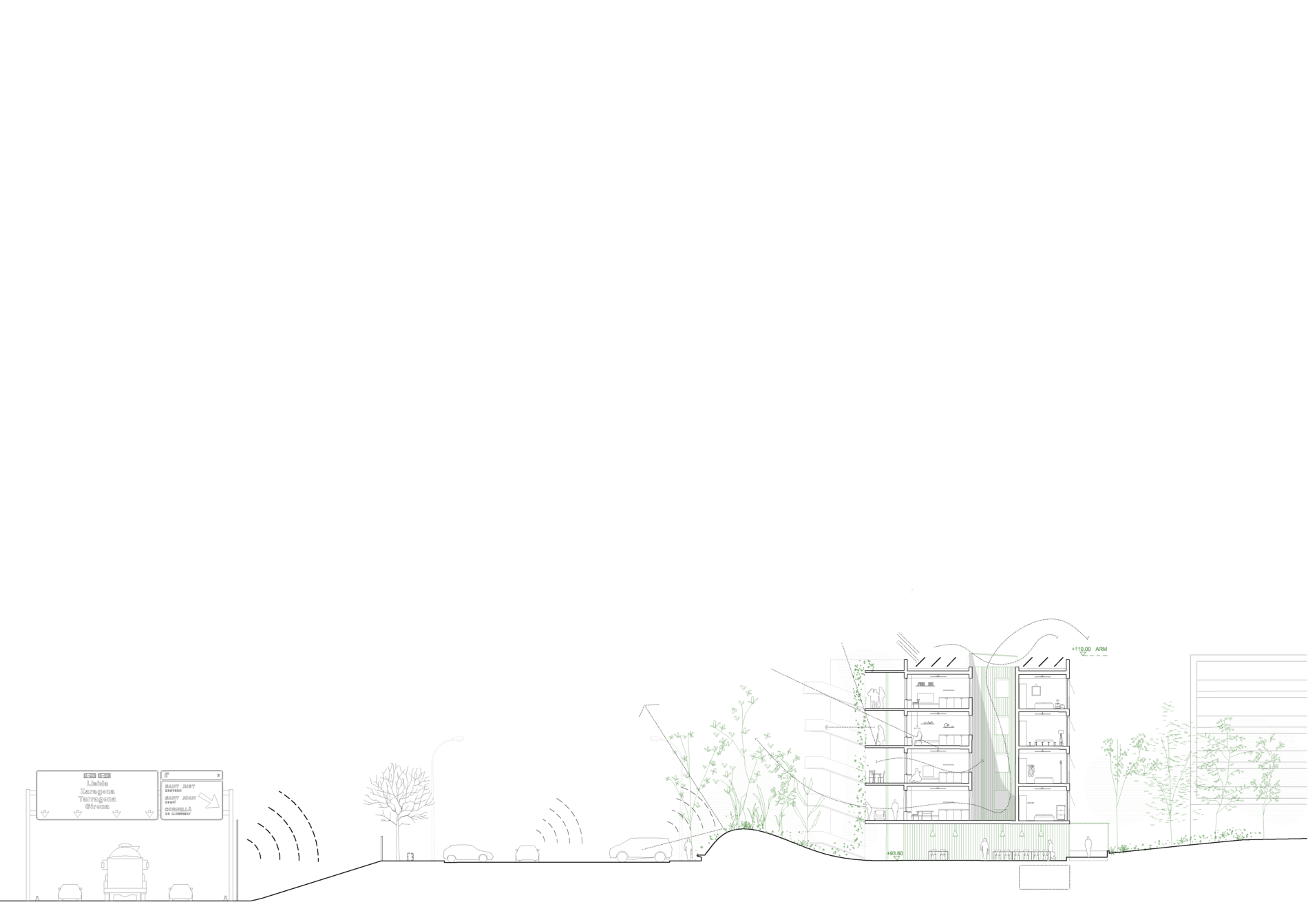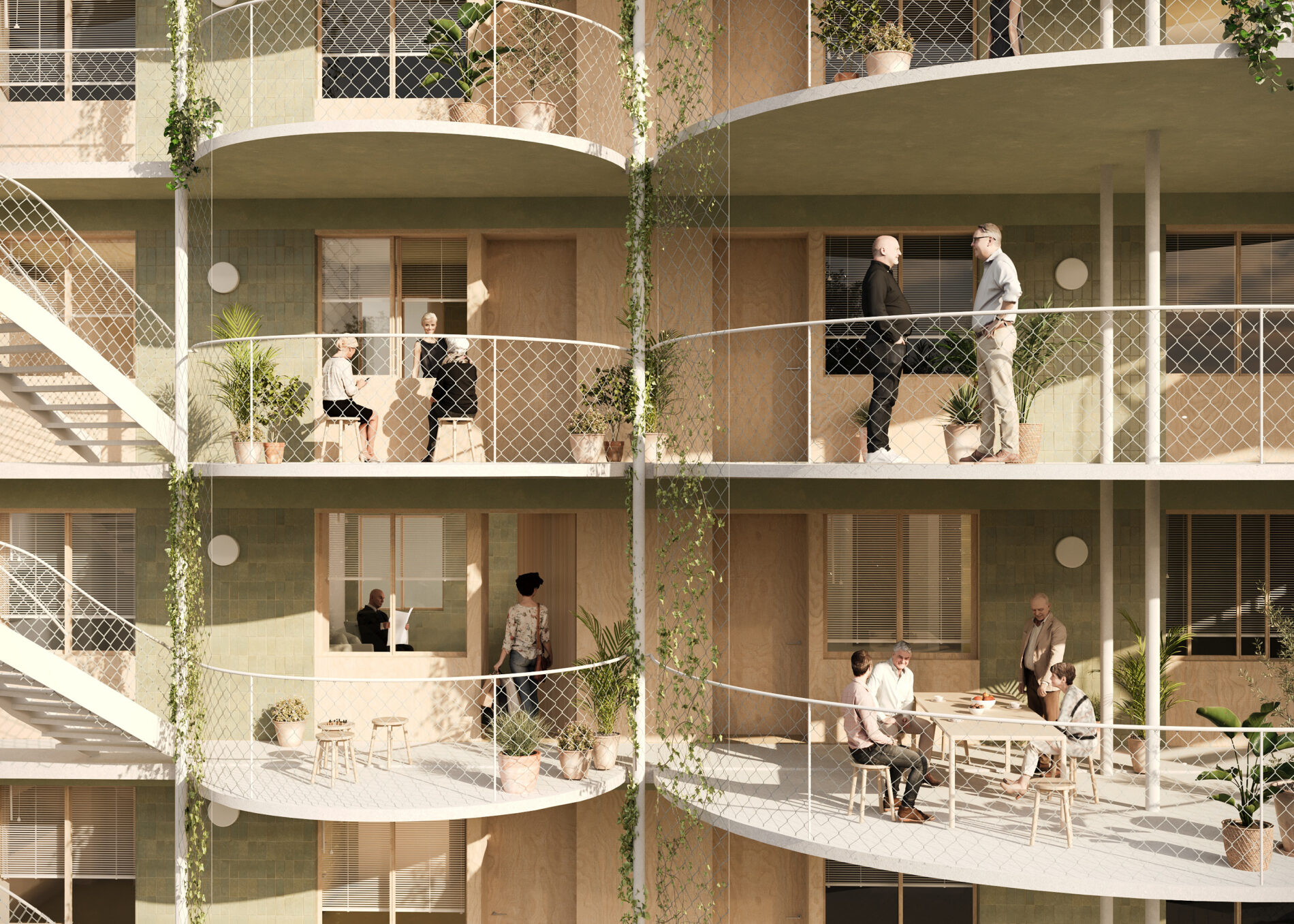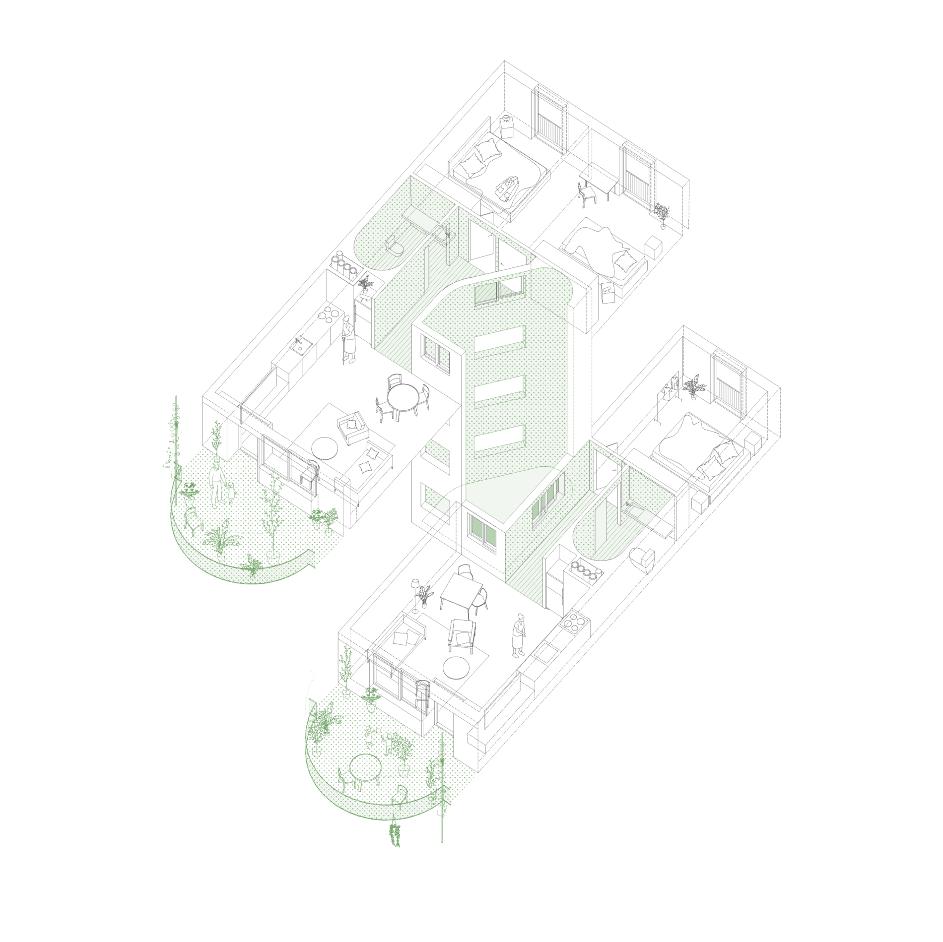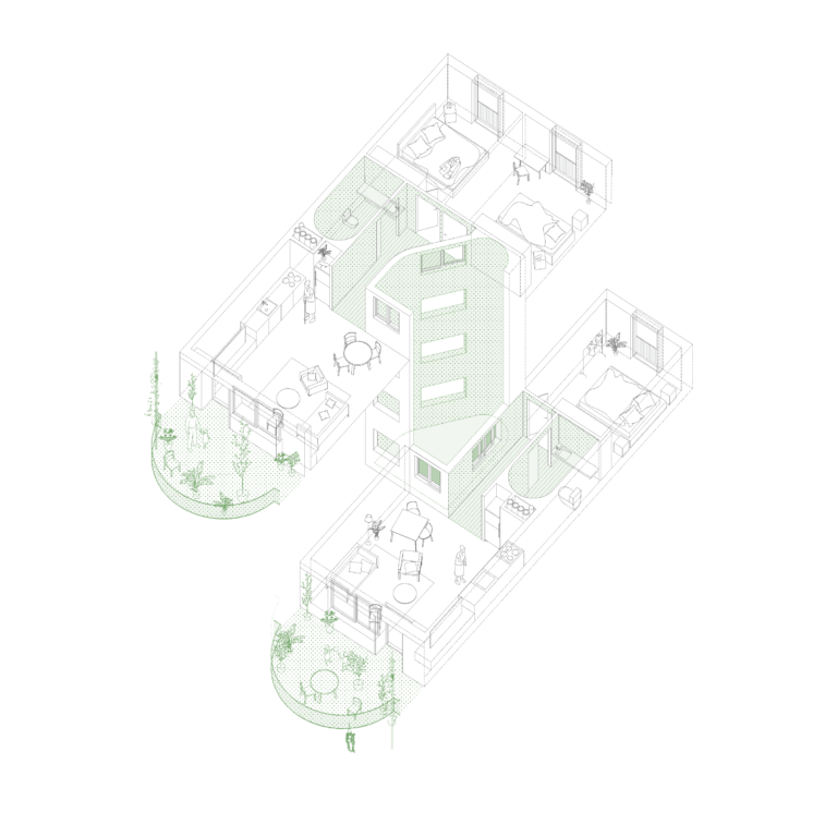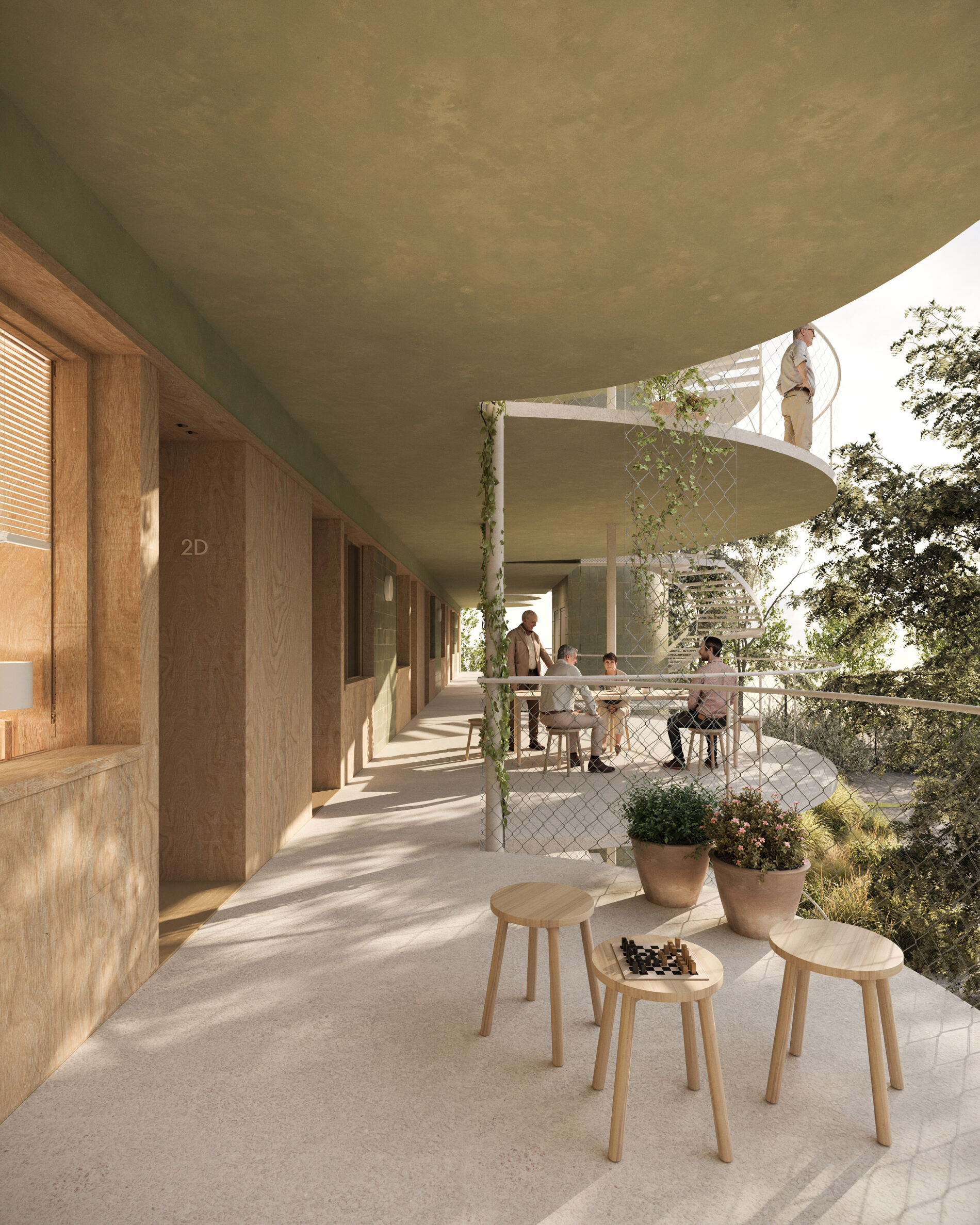 Las pasarelas actúan como calles de acceso a las viviendas y favorecen, gracias a su tamaño y geometría, la relación entre los usuarios. Estos espacios de acceso y estancia quieren convertirse en una extensión de la propia vivienda donde las personas se encuentren y los límites “dentro-fuera” se desdibujan para generar comunidad.